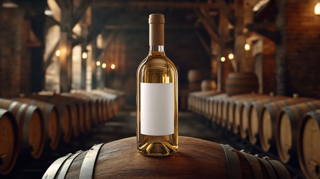 White wine bottle standing on barrel in rustic cellar with barrels background