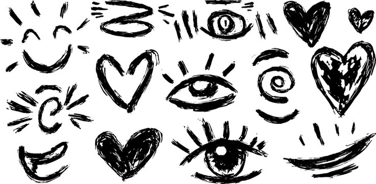 Set of handdrawn emoticons showcasing diverse expressions. Includes winking, heart eyes, and smiling faces. Simple black on white style. Fun and expressive.