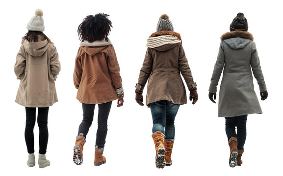 Collection of women wearing winter outfit back view full body shot over isolated transparent background