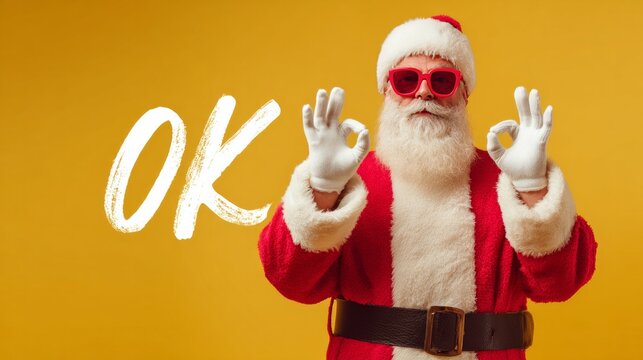 A vivid winter scene featuring a husky dog dressed in festive attire amidst snow. The dog is adorned with a Santa hat, and its fur is a mix of white and gray.