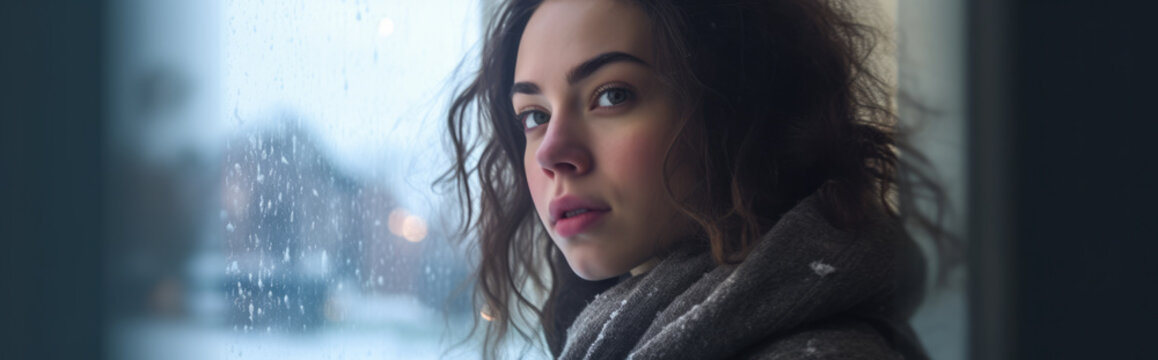 Banner of a young woman contemplating a winter scene from her window. Generative AI