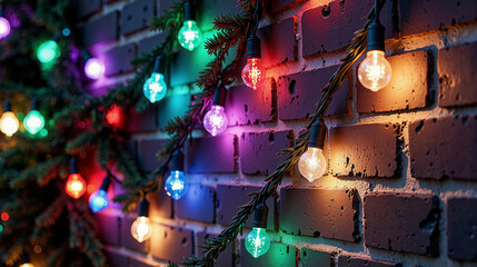 Festive lights twinkle on a brick wall, strung along a pine branch. Multi-colored holiday lighting enhances a cozy, wintry aesthetic.