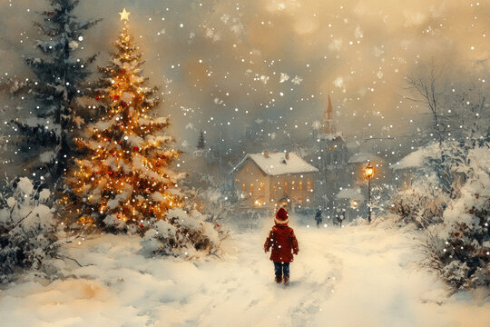 Snowy winter village at night with festive lights