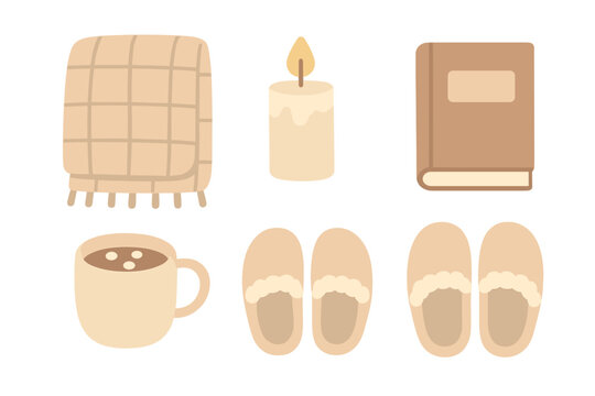 Cozy home essentials collection featuring a warm blanket, burning candle, hot drink, book, and comfortable slippers
