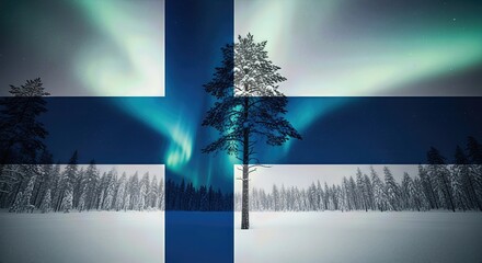 Finland's Independence Day, December 6. National public holiday banner. Aurora borealis illuminates a winter forest and single pine. Congratulations greeting promotion.