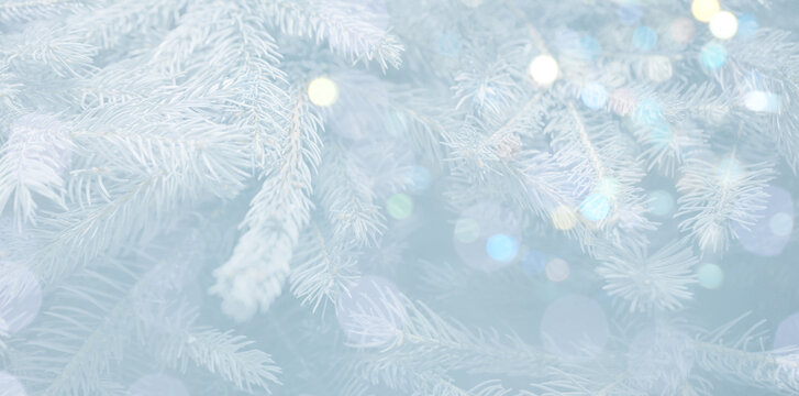 Christmas greeting card with fir tree branches and bokeh lights. Banner design