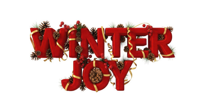 Merry christmas text with snow, pine branches, holly berries, and pine cones, celebrating winter holidays, on transparent background