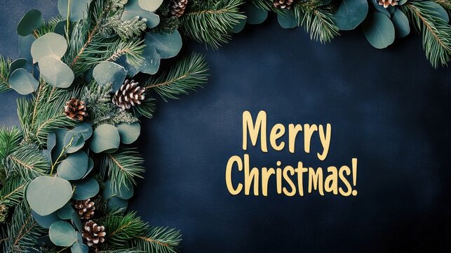 Festive Christmas Greeting with Pine Cones and Eucalyptus on Dark Background