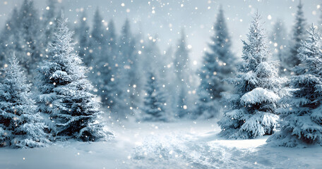 Snowfall in winter forest.Beautiful landscape with snow covered fir trees and snowdrifts.Merry Christmas and happy New Year greeting background with copy-space.Winter fairytale.