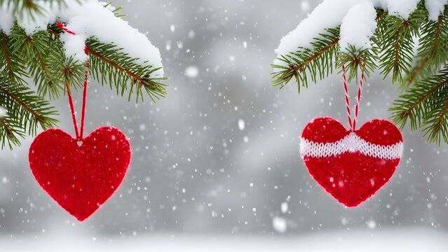 Red knitted heart ornaments hanging on snowy pine branch. Christmas decoration and winter love. Two heart shaped crafts on a tree with falling snow in the background