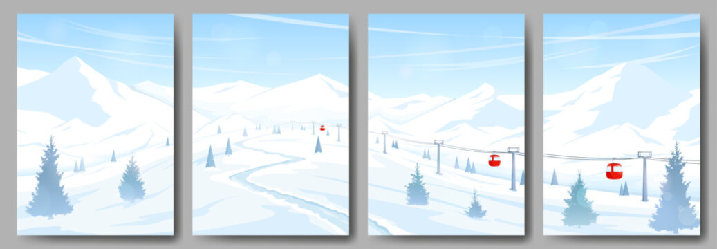 Set of retro Ski Posters with mountain scenes from Vale, Aspen, Park City. The postcards feature skiers and snowboarders on the slopes, and the mountains are covered in snow. Vector art