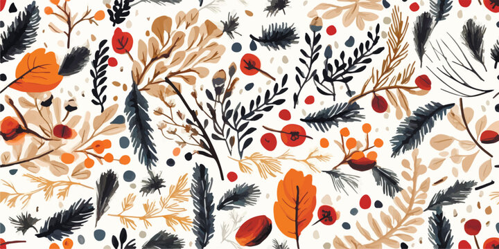 Seamless pattern. Hand drawn vector illustrations - Forest Autumn collection. Spruce branches, acorns, pine cones, fall leaves. Design elements for invitations, greeting cards, quotes, prints, fabric