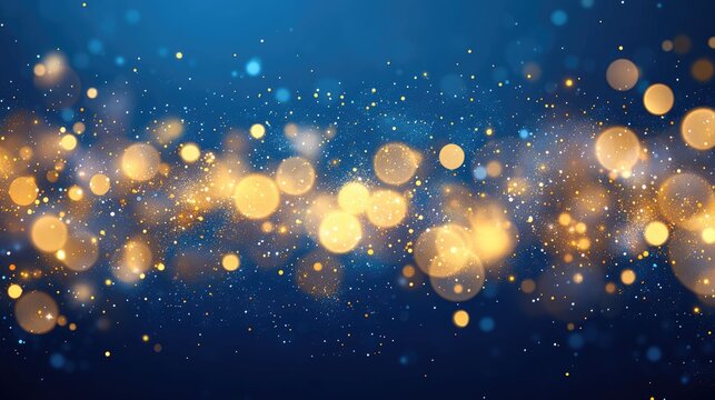 Festive soft bokeh background with shimmering golden particles against a deep blue canvas, ideal for holiday celebrations and themed designs.