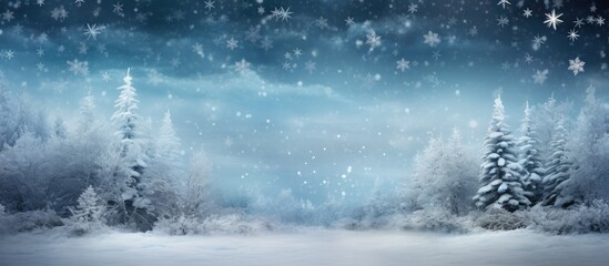 Magical winter wonderland background with sparkling snowflakes, snow-covered trees, and a textured snowy ground. The enchanting, pristine scene creates a sense of wonder and beauty, perfect for