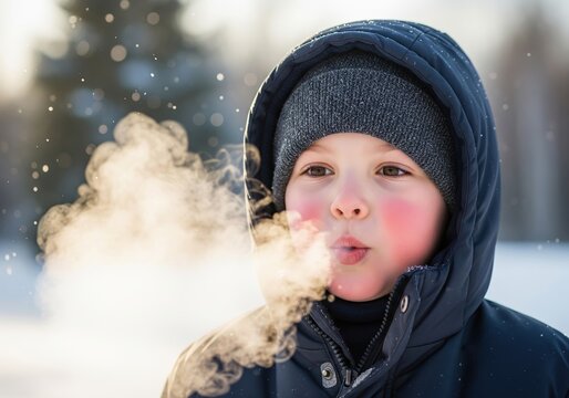Young boy with rosy cheeks breathing out steam on a cold, sunny winter day