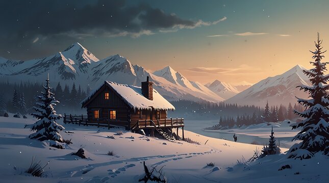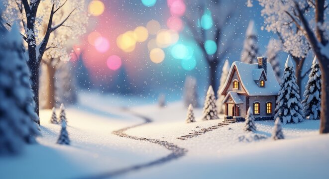 Enchanting winter scene evokes cozy cabin getaway with snow-covered trees and gentle snowfall, perfect for holiday greetings or winter promotions