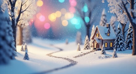 Magical Snowy Winter Village Landscape with Colorful Holiday Lights – Perfect Festive Scene for Christmas, Greeting Cards, Seasonal Design and Wintertime Concepts