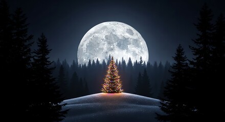 A festive christmas tree in a snowy winter forest landscape illustration, adorned with blue decoration and a bright star, perfect for a holiday card