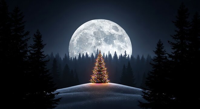 Winter snowy pine tree forest illustration, with lights and snow covered branches
