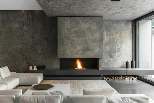 Home interior design plan with a gray sofa and floor-to-ceiling windows, showcasing the outdoor view.. Beautiful simple AI generated image in 4K, unique.