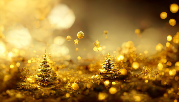 3D Render Golden Merry Christmas HD Wallpaper with bokeh defocused lights. Beautiful artwork seasonal illustration and copy space background.