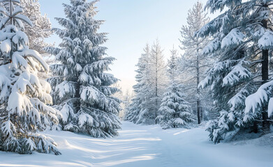 Snow-covered path through a forest of frosted pine trees.