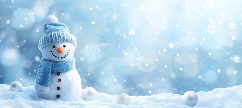 Festive snowman closeup on snowy background   winter holiday banner with copy space