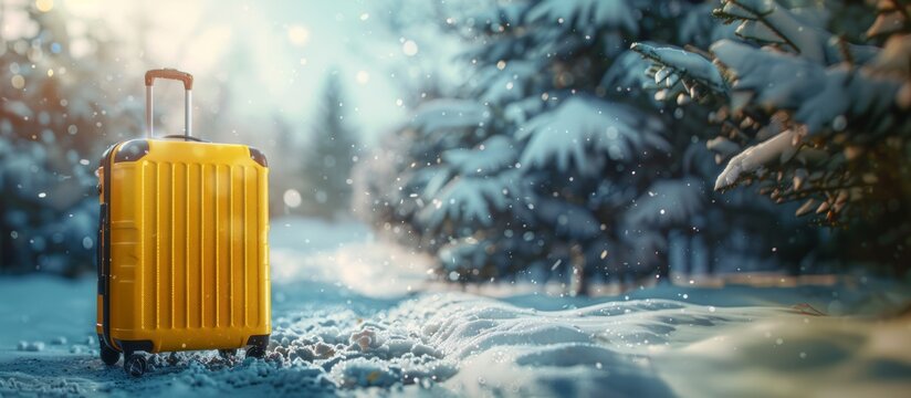 Winter travel holiday cabin snow destination with white suitcases cozy mountain chalet vacation rustic snowy countryside getaway snowy forest tourism accommodation abnb rent home holidays copy space