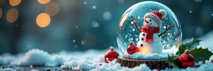 Snowman in frosty glass snow globe with Christmas ornaments, holly leaves, frosted landscape, wintry atmosphere