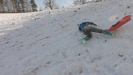 A boy sledging has a wipeout and falls off his sledge into the fresh snow