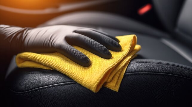 Gloved hand wiping car seat with yellow cloth, symbolizing cleanliness, care, and professional car detailing, realistic textures, warm natural lighting, shallow depth of field.