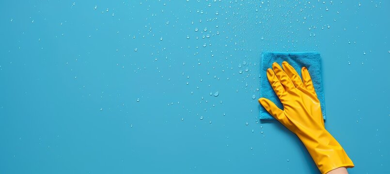 Hand in yellow glove cleaning surface for hygiene and cleanliness