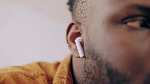 Outdoors portrait of a man who uses a phone and wireless headphones