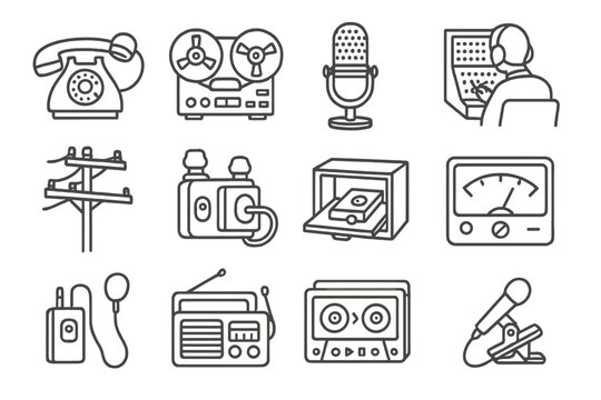 Analog Wiretap Icons. Line style icons of old-school analog wiretaps: rotary phone with receiver tap, reel-to-reel recorder, large