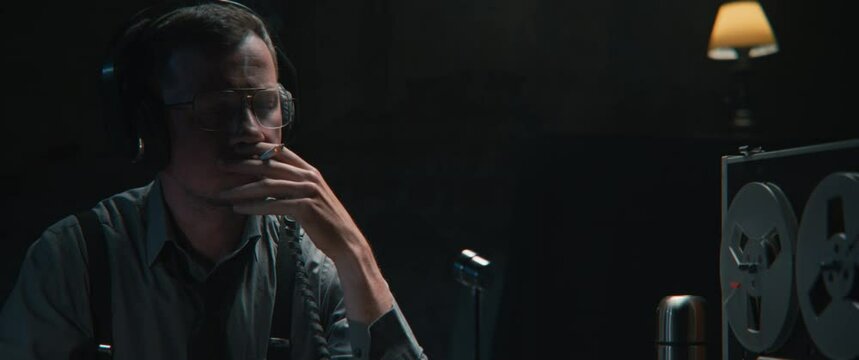 Secret agent listens on the reel tape recorder. Officer wiretapping in headphones. Spying of conversations. Intelligence gathering. Espionage concept. Report information to superiors.
