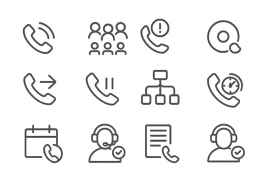 Line Style Phone Icons. Line style icons of phone support: ringing phone icon, call queue icon, missed call alert, call recording