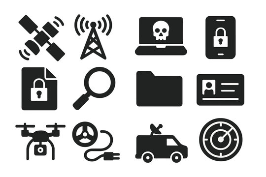 Intelligence Gathering Icons. Solid style icons of intelligence gathering: satellite, listening tower, hacking laptop, secure