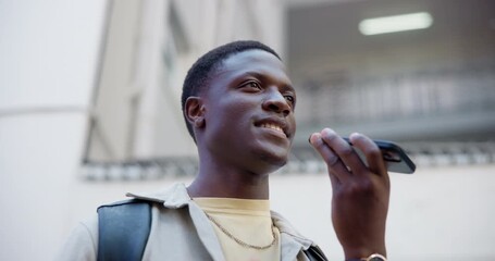 Phone, record and student or black man in city for communication, social media voice note and contact. Networking, college scholarship and low angle with person outdoor for university feedback