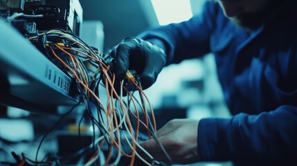 Electrician replacing faulty wiring in an office. Featuring precision and problem-solving