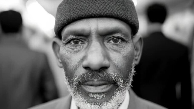 Elderly African man with a contemplative gaze, wearing a knit cap in an outdoor setting, conveys wisdom and life experience, suitable for cultural and community themes
