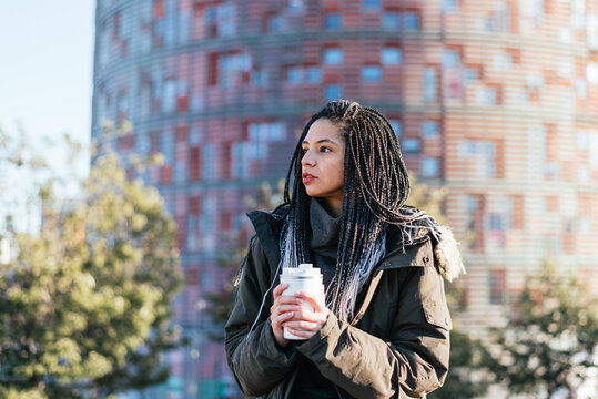 Pensive Hispanic female in warm outerwear with dreadlocks and to go thermos mug with hot beverage standing on street near building in city