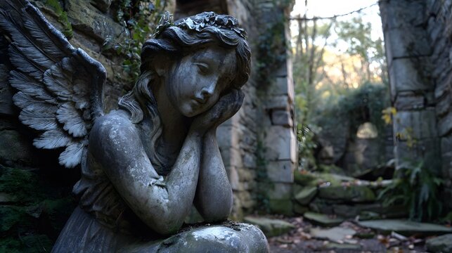A wistful fairy statue in an abandoned castle courtyard, moonlight reflecting off her wings