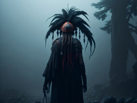 Evil Witch Doctor with a Head Dress in a foggy void. Generative AI