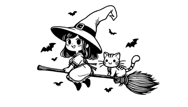 Line drawing, witch and cat flying on a broom, cute cartoon illustration