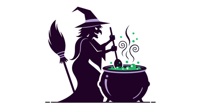Silhouette of a Witch Stirring a Cauldron with a Broom.