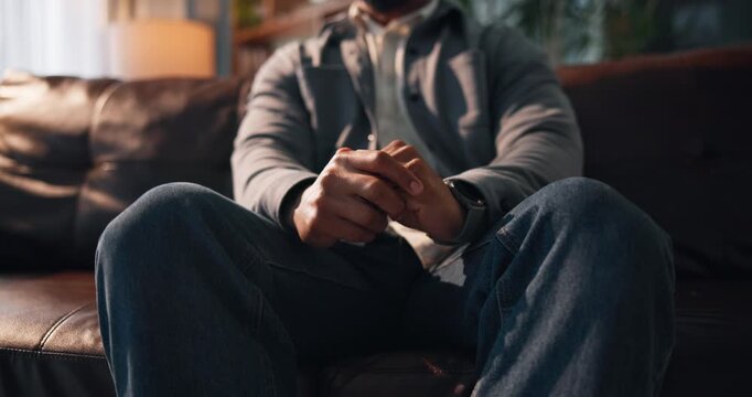 Man, anxiety and nervous hands with stress on sofa for panic, overwhelmed or mental health in home. Closeup, male person or fidget with pressure for paranoid, substance withdrawal or trauma in house