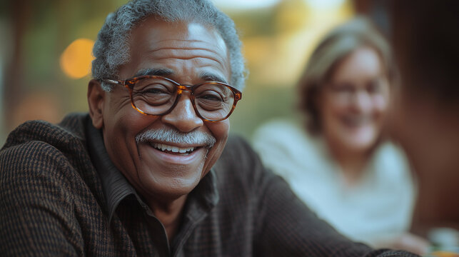 Group of seniors enjoying a board game night, laughing and chatting around a table.