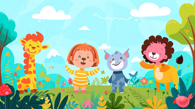 Playful cartoon characters, imaginative scenes, for children, flat design illustration