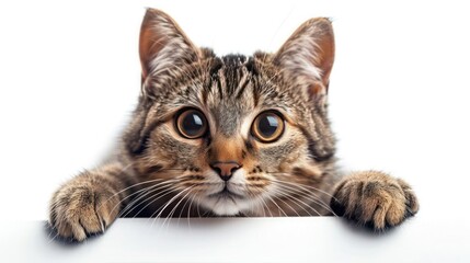 Funny Pet Cat Holding Sign on Blank White Background for Web Banner - Copy Space Available