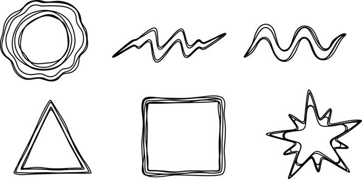 Basic shapes doodle icon set. Vector pictograms of wobbly circle, jagged line, simple hand-drawn illustration.